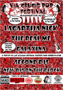 Con el renacer de la sala Madchester se recupera uno de los festivales perdidos en la capital durante varios años, el Vía Crucis Pop Festival. Para esta nueva edición el cartel era bastante apetitoso, compuesto por los conciertos de tres grupos -Galaxina, The Real Me y Lagartija Nick- y dos sesiones DJs -Second DJs y New DJs on the block- prometiendo diversión hasta altas horas de la madrugada.