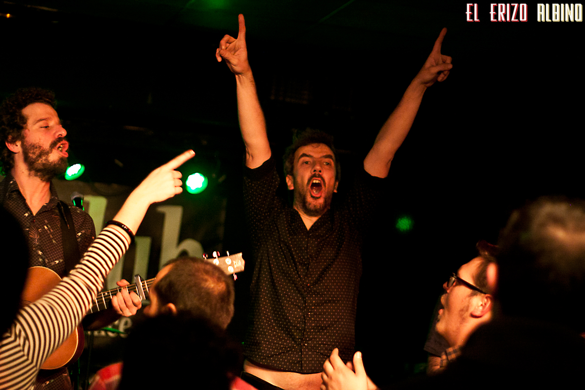 Después de “Las noches de insomnio”, el frontman volvió a quedarse sólo en el escenario para interpretar “Mejor morir de sed que ir a lo fácil (4º)”. Al regresar la banda Nani aprovechó para presentar a Juan Alberto, “nuestro gurú personal”. Continuó el concierto y Juan Alberto se deshizo de la guitarra para cantar “Caerán los bancos” dedicándosela a “Todos los que lo están pasando mal, incluso a los que han tenido que irse fuera, “los aventureros””. Con “Dame tu mano” vino la primera despedida, a lo que el público respondió con un sonoro “Nooooo”.