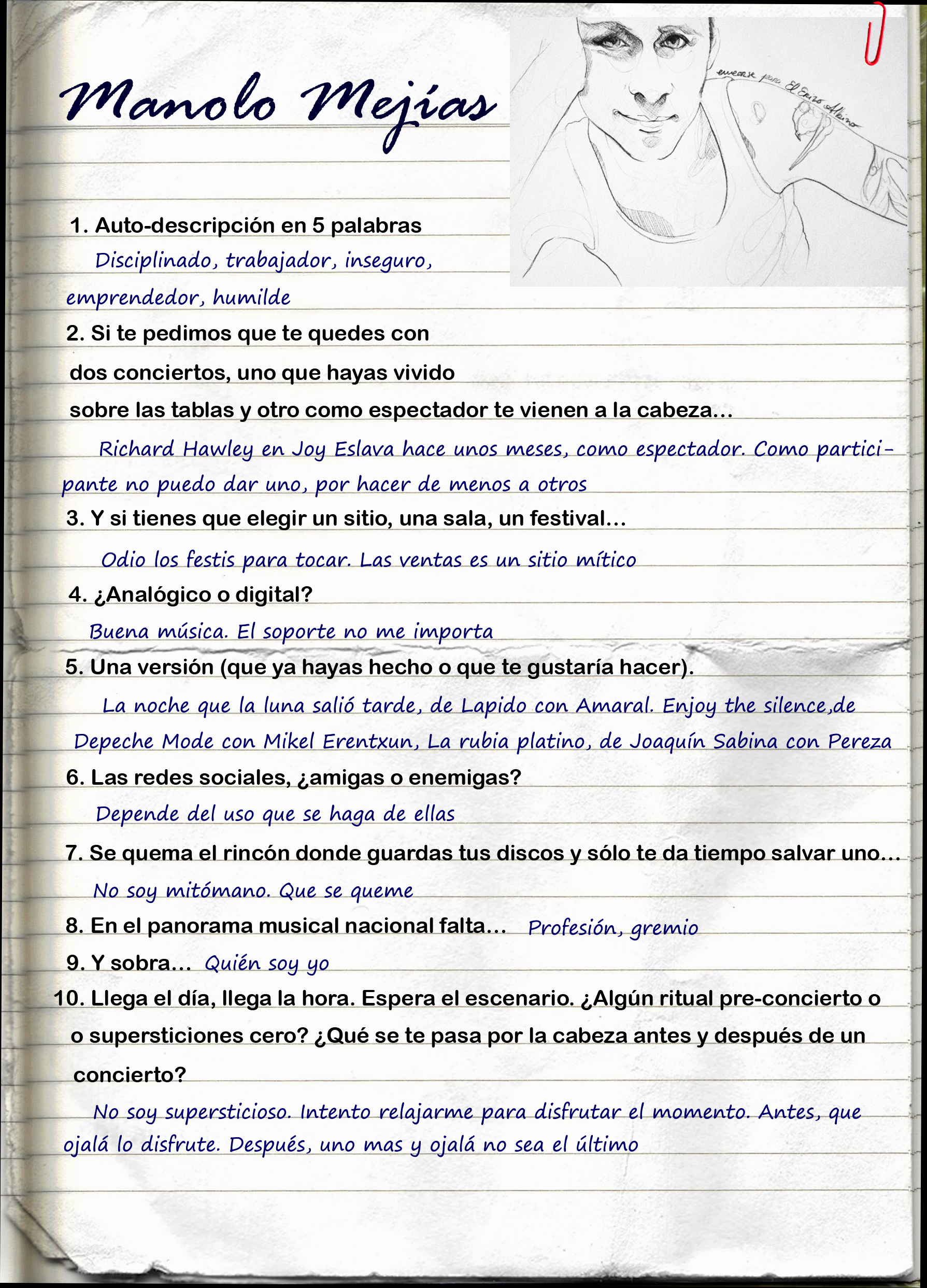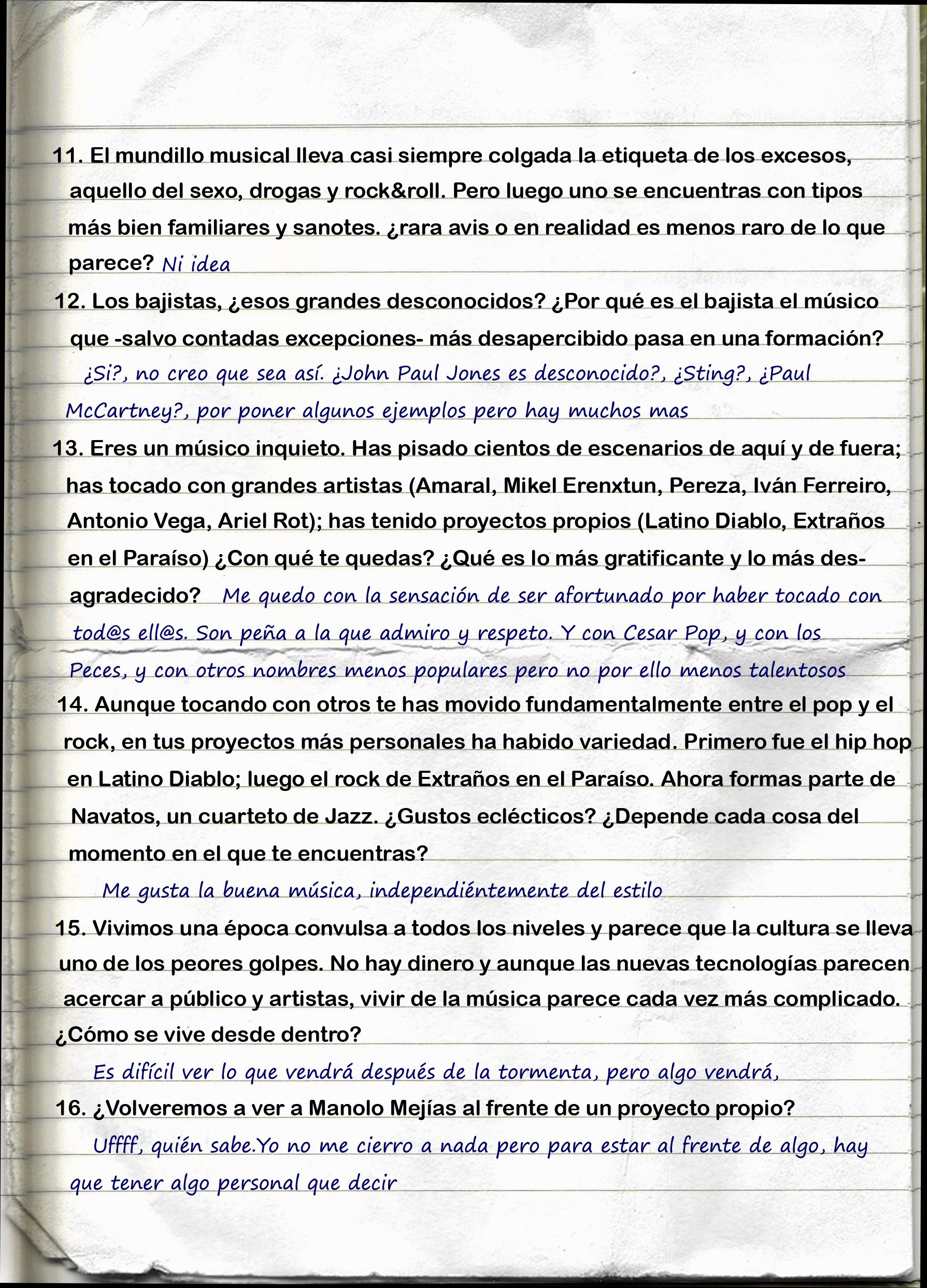 A veces no reciben el suficiente reconocimiento. Muchas, reciben más sombras que luces sobre las tablas y son casi unos desconocidos para el gran público, pero sin ellos, sería difícil sacar adelante giras y discos. Son esos músicos que viven dedicados a sus instrumentos y que aportan su granito –a veces granazo- de arena a mil y un proyectos –ajenos y a menudo también propios. El que hoy nos visita es un tipo inquieto; un músico comprometido, con unas ganas continuas de aprender y mejorar. Grande con las cuatro cuerdas y grande también como persona, Manolo Mejías lleva ya más de quince años dedicado al bajo. Ha acompañado en estudio y sobre los escenarios a gente como Mikel Erentxun, Amaral, Pereza, Iván Ferreiro, Antonio Vega, Nawja Nimri o Dani Martín y por el camino le ha dado tiempo a dejar varios discos con proyectos propios –del hip-hop de Latino Diablo al rock de Extraños en el Paraíso-. En los últimos tiempos se ha pasado al jazz y no es raro encontrarle subido a las tablas con un contrabajo como parte del cuarteto Navatos.