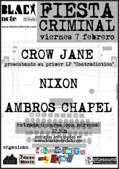 Este viernes 7 de febrero tendrá lugar la primera Fiesta Criminal de 2014 en el valenciano Black Note Club, a las 22:30h y por sólo 8€ (con cerveza). La música en directo correrá a cargo de 3 bandas: las valencianas Crow Jane y Ambros Chapel y la almeriense Nixon. Sigue leyendo