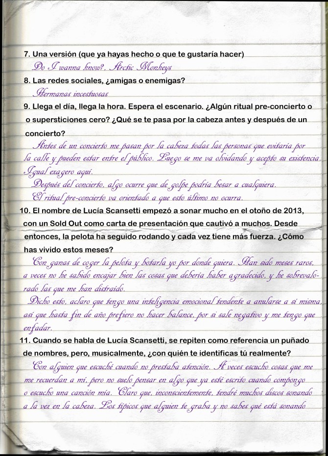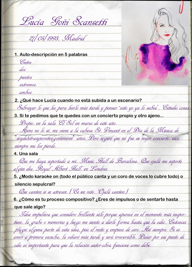 En el Día de la Música del año pasado la emisora de radio online Rockola FM y los locales de ensayo Box In Box tuvieron a bien de celebrar tan significativo día organizando un festival emitido en streaming con más de 10 horas de música en directo. Se acercaba la hora de almorzar y nos íbamos a desconectar cuando una joven irrumpió con su voz y su piano en nuestra pantalla. Con su primer tema «Summer love» nos conquistó y desde entonces le seguimos la pista. A principio de verano pudimos escucharla por primera vez en vivo junto a Miss Caffeina y Trèpat en Úbeda gracias al concierto organizado por la Asociación Animalismo (ver +). La semana pasada volvimos a disfrutar con su directo junto a The Noises (ver +) gracias a los conciertos acústicos organizados por Zapatillas Victoria y Gigntik. Con motivo de esta cita invitamos a Lucía a participar en nuestra sección de (Auto) Retratos y aquí tenéis el resultado.