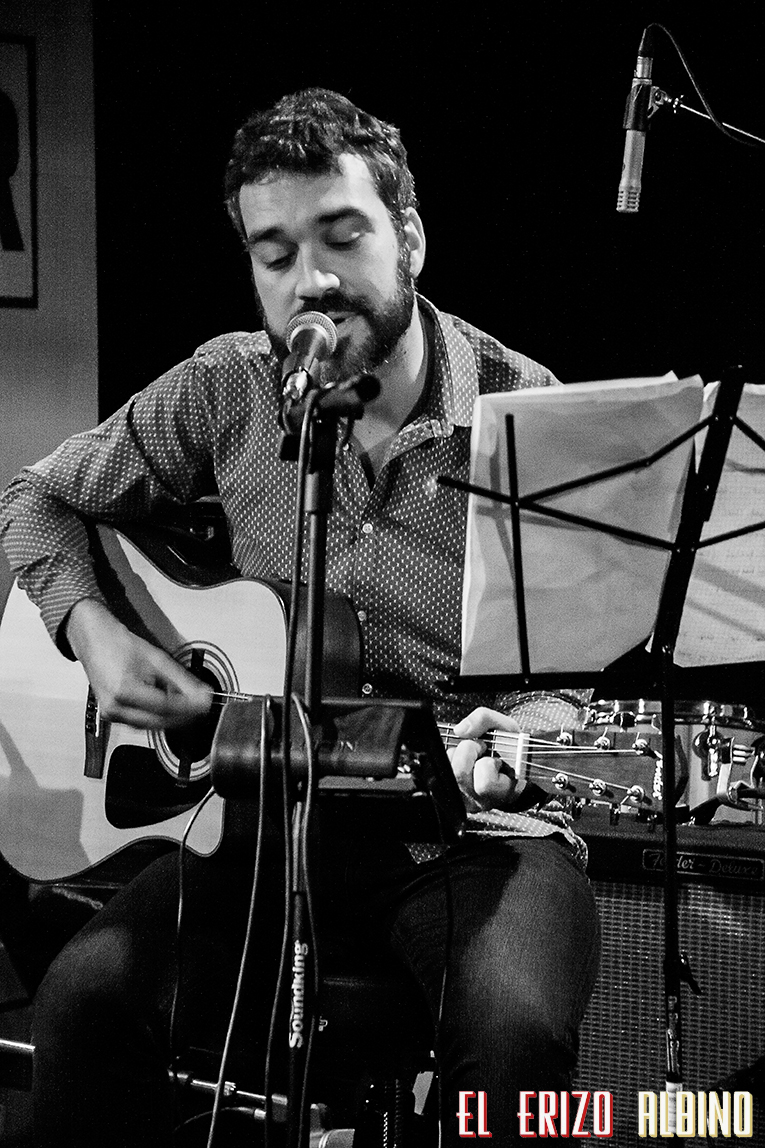 David salió al escenario para enfrentarse a una sala en la que el aforo no era precisamente multitudinario –seguramente por la época de exámenes y un frío al que no estamos acostumbrados-. Tras sentarse en una silla y calzarse su guitarra, comenzó a tocar un tema instrumental, “jugando” con las pedaleras (reverberaciones, distorsiones,…) y un casiotone, con un resultado generalmente bueno –quitando algún momento de acople-. Tras un primer tema instrumental, cambió de registro y se pasó a canciones con letra, en las que la guitarra sonó más limpia y ofreció un sonido más luminoso que en el tema inicial. Aprovechó bien su tiempo sobre las tablas, ofreciendo un tema tras otro sin apenas descanso. Sonaron así canciones como “En construcción”, “Todo va a ir bien” o “El poder del brócoli”, tema con el que cerró su actuación y pasó el testigo a Negroazulado.