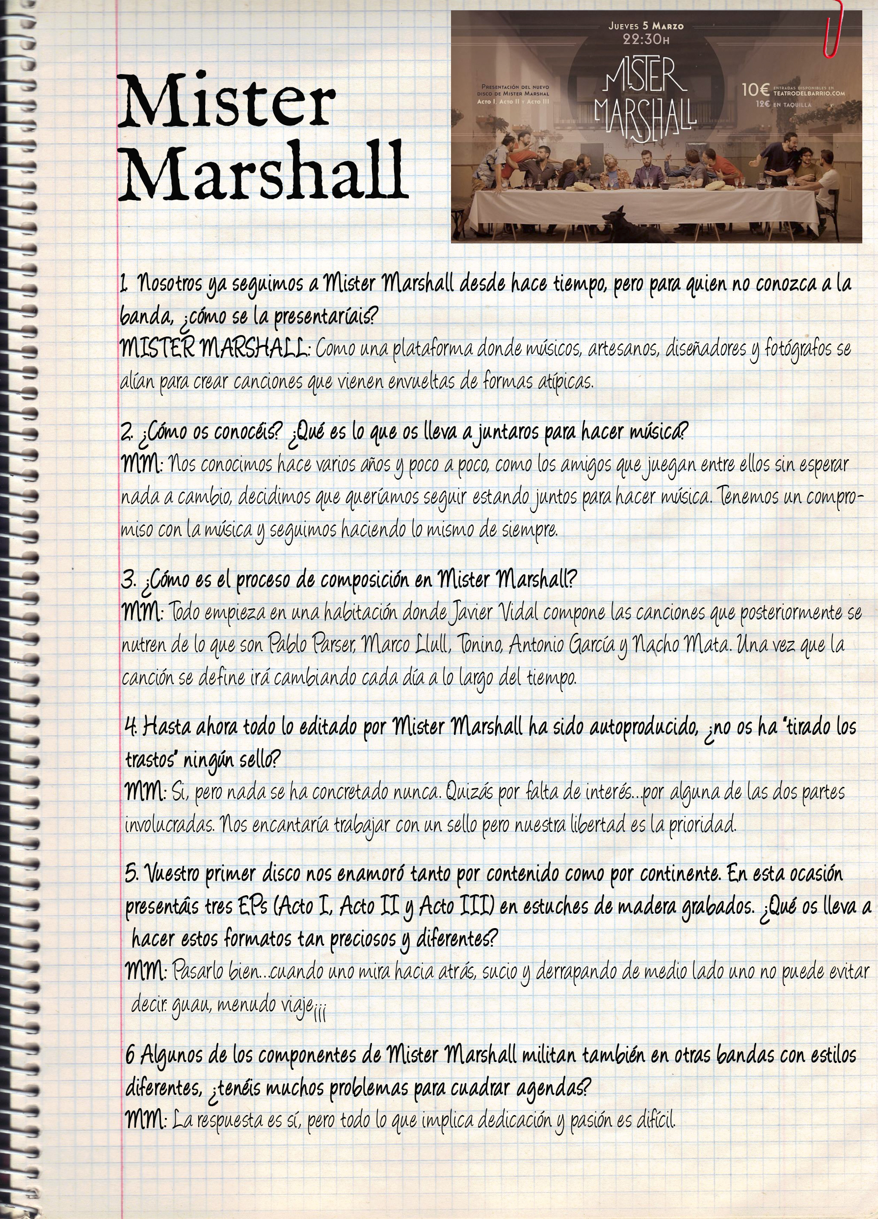El sexteto Mister Marshall presenta oficialmente su segundo disco este jueves día 5 de marzo en el Teatro del Barrio en Madrid (hazte con tu entrada aquí). Esto nos ha servido como excusa para hacerle unas preguntas a una formación que nos tiene enganchados desde una noche en que Joaquín Guzmán echó una moneda en su Rockola para poner «Walden 3».