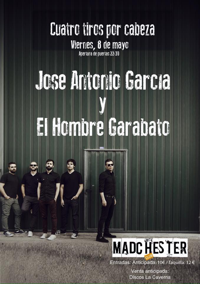 Este viernes 8 de mayo el almeriense Madchester Club recibe la visita de José Antonio García y El Hombre Garabato. El granadino José Antonio García es de sobra conocido por haber sido la voz de la mítica banda 091, pero a lo largo de su carrera musical ha formado parte de distintos proyectos como TNT, Mezcal o Guerrero García. El Hombre Garabato inició su andadura en 2007 con la grabación de su primer EP, al que seguirían los largos La vida y otros defectos (2010) y El héroe más cobarde (2013).