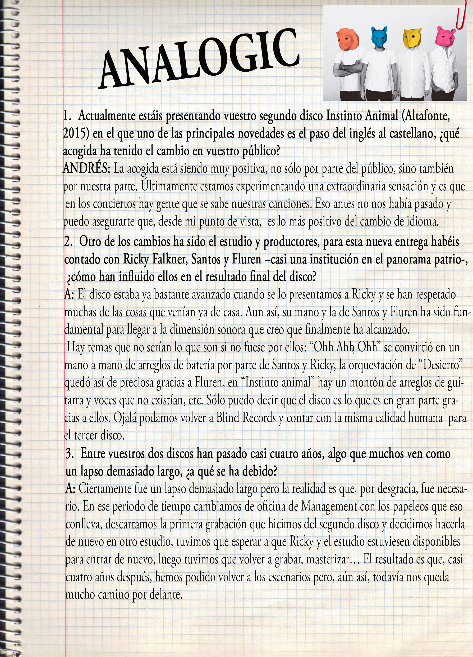 Después una pausa en su carrera, Analogic ha vuelto a la carga con nuevo trabajo bajo el brazo. Una vez pasado el verano en el que se les ha podido ver en diversos festivales, su guitarrista Andrés Monge nos dedica parte de su tiempo para contestar las preguntas de este entrevista que hoy os presentamos.
