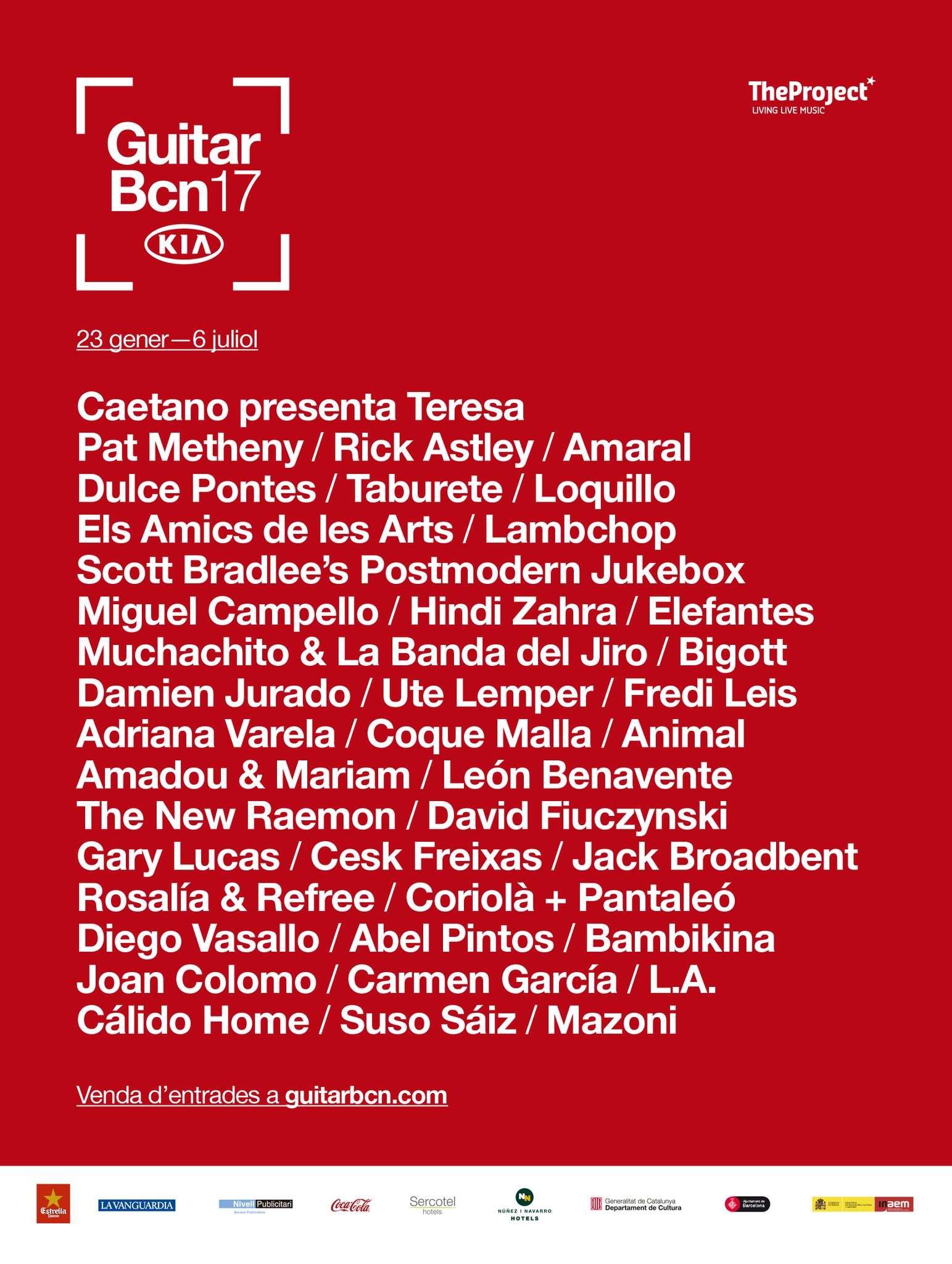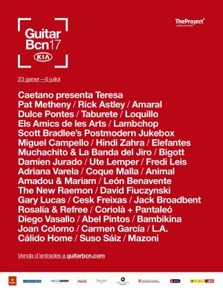 Pasarán por el Guitar este 2017, los brasileños Caetano Veloso y Teresa Cristina, que compartirán escenario en el maravilloso Palau de la Música el 28 de abril, el mítico Rick Astley que nos transportará a los 80 y 90 en la sala Barts el 29 de abril, Loquillo con sus clásicos del Rock&Roll en español llenará el Sant Jordi Club el 13 de Mayo, y Amadou y Mariam nos presentarán su nuevo disco, La Confusión (2017), con el que nos transportarán seguro a su tierra natal, Mali.