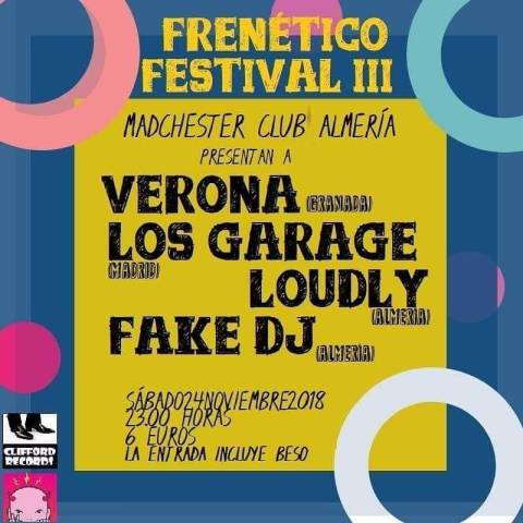 Este sábado 24 de noviembre la música en directo tiene una nueva cita en Madchester Club, nada menos que 3 grupos y un DJ de la mano de la tercera edición de Frenético Festival. El cartel está formado por Verona, Los Garaje, Loudly y Fake DJ.