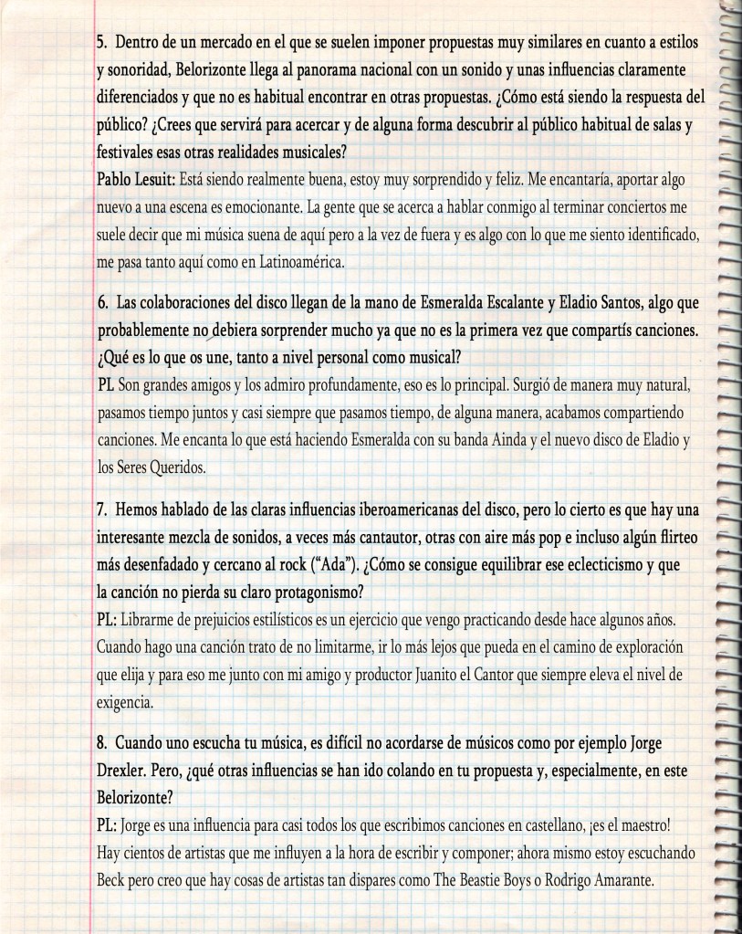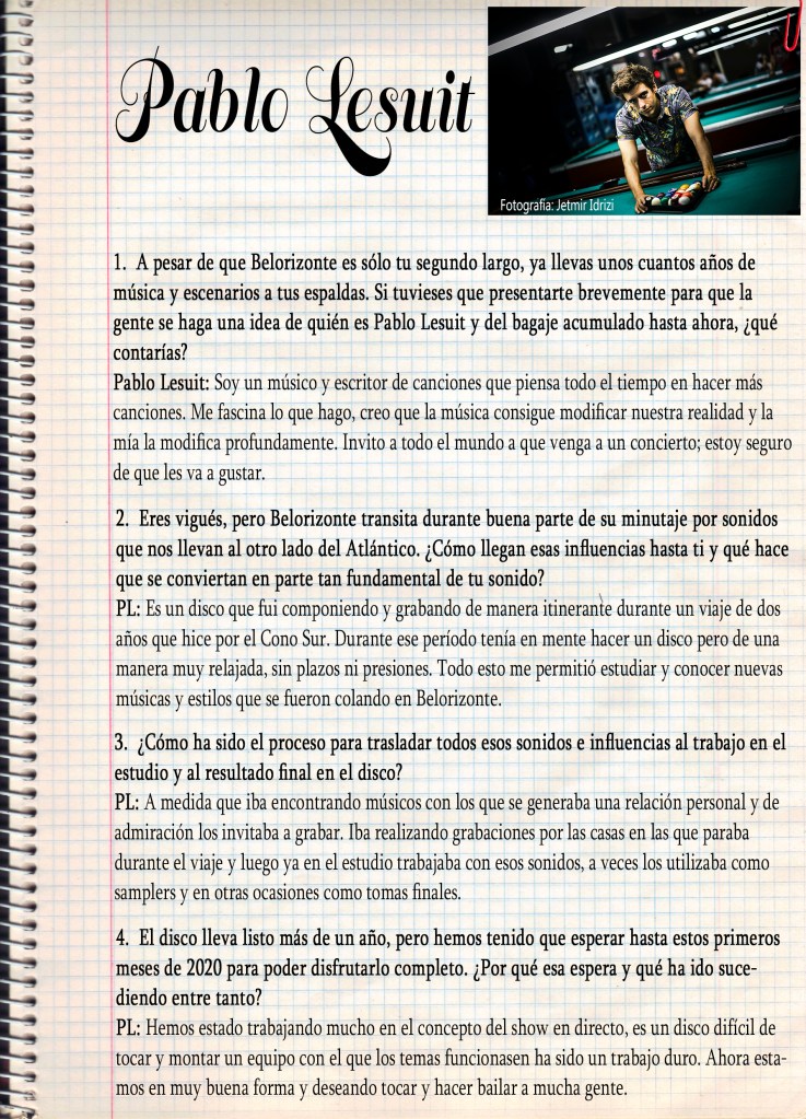El pasado 21 de Marzo estaba previsto que la gira de presentación del segundo largo de Pablo Lesuit, Belorizonte, hiciera parada en Almería y eso servía de excusa para hacerle al músico vigués algunas preguntas sobre este nuevo trabajo y así abrir boca antes de su visita almeriense.