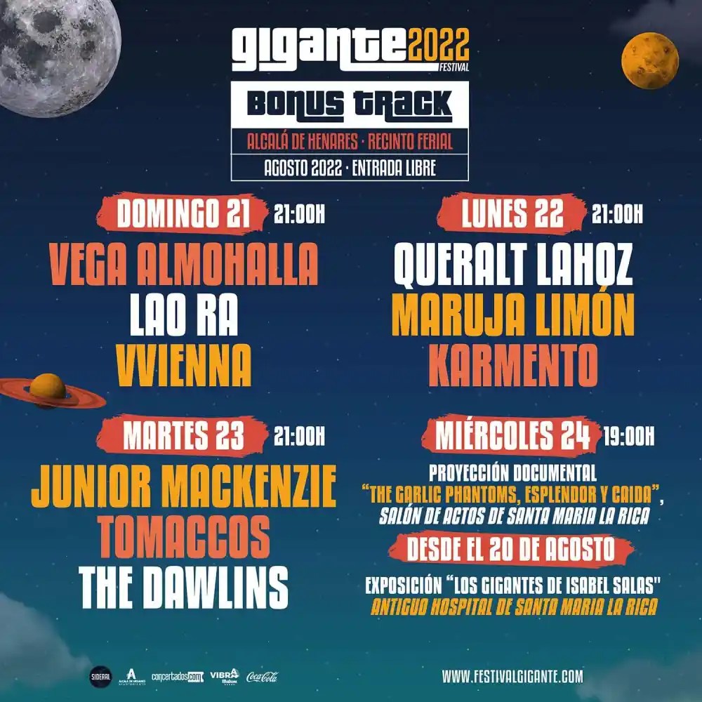 Oficialmente, el festival da comienzo el jueves 25 de agosto en el recinto amurrallado de la Huerta del Obispo y lo llenará de música Jueves 25, Viernes 26 y Domingo 27. Pero, como ya sucediese en 2021, habrá ya un calentamiento previo los días 21, 22, 23 y 24 de agosto. Bajo el nombre de Bonus track quedarán las primeras actividades, que incluirán conciertos con acceso libre en el recinto ferial los días 21, 22 y 23, la proyección del documental “The Garlic Phantoms, esplendor y caída” el miércoles 24 en el salón de actos de Santa María la Rica y la exposición de las ilustraciones de Isabel Salas, “Los Gigante de Isabel Salas”, que podría visitarse desde el día 20 en el Antiguo Hospital de Santa María la Rica.