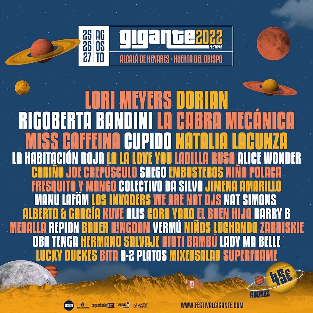 Casi 50 artistas componen el cartel de esta octava edición del Gigante -segunda alcalaína-. Y aunque es inevitable que los ojos y los oídos se nos vayan a platos fuertes como Lori Meyers, Dorian, Rigoberta Bandini o La Habitación Roja, no hay que perder de vista otras propuestas. A quien nos conoce no le sorprenderá que apuntados en nuestra lista de imperdibles estén nombres como Alis, Kuve o Alice Wonder; ni que tengamos especiales ganas de volver a disfrutar de propuestas como Kingdom! u Oba Tenga, que tanto nos han hecho disfrutar en sus recientes paradas por Alcalá.