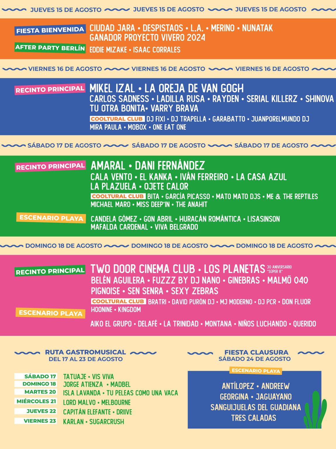 En lo que respecta a los artistas, el cartel de este año nos trae propuestas que, si habéis leído este blog, sabréis que forman parte de nuestra vida desde hace años, como Amaral, Carlos Sadness, La Casa Azul, Sexy Zebras, Shinova,… y que seguro que más de uno y más una también cantará a modo karaoke. Cooltural Fest nos permitirá reencontrarnos con Aiko El Grupo, que tan buen sabor de boca nos dejó el año pasado en el Pulpop Festival, así como con L.A., Nunatak, Ladilla Rusa, Calavento, El Kanka, Ojete Calor, La Oreja de Van Gogh… Además, también nos dará la oportunidad de ver por primera vez en directo a grupos como Lisasinson, Merino, La Plazuela (regalé mi entrada cuando vinieron a Almería porque me puse malico), Ginebras, Dani Fernández… Este año, la nota internacional viene de la mano de los irlandeses Two Door Cinema Club, que actuarán la jornada del domingo 18 de agosto, compartiendo cartel con Los Planetas, que vienen con su gira 30 aniversario de Súper 8. En el Cooltural Club nos podemos encontrar propuestas como Me & The Reptiles, nuestro querido Don Flúor, Juanporelmundo DJ o K!ngdom.