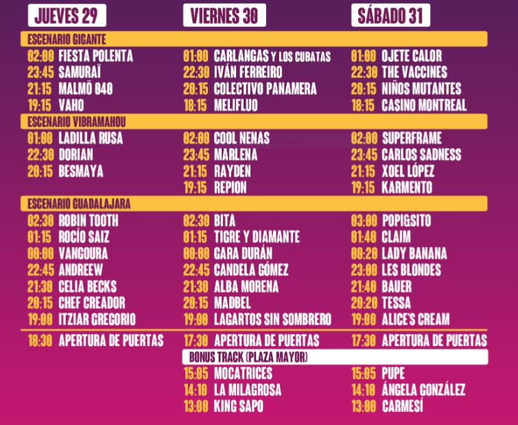 Con todos ellos, se completa un cartel de nada menos que medio centenar de propuestas que, durante tres días, pondrán la banda sonora en Guadalajara, con una programación que, un año más, incluirá, además de los 3 escenarios del recinto principal, el Bonus Track en forma de sesión vermú el viernes y el sábado en la Plaza Mayor.