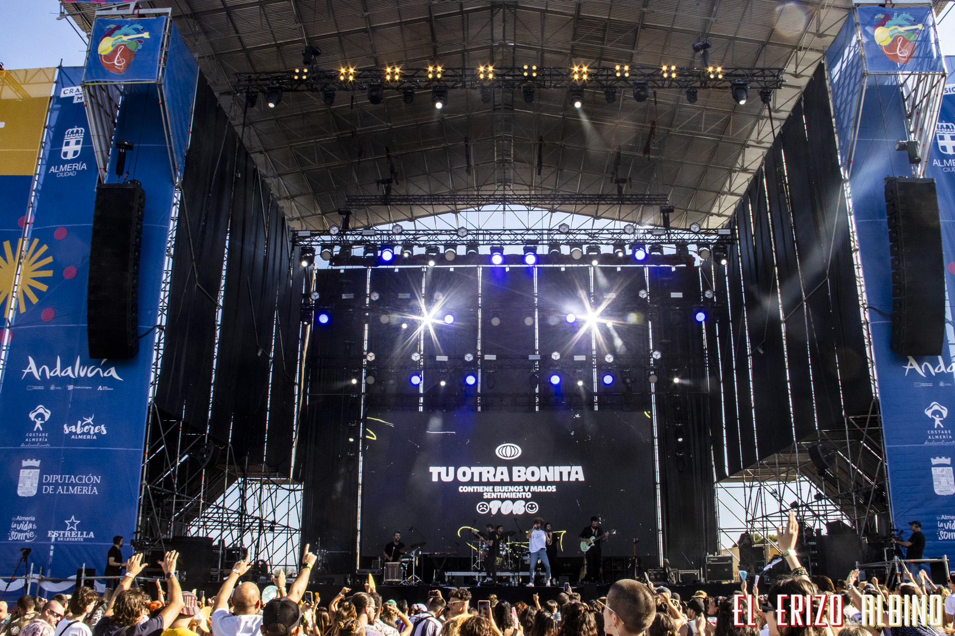 Los encargados de inaugurar el nuevo recinto, en el Escenario Fundación Music For All, fueron unos músicos de sobra conocidos en Almería y en el festival, en el que ya habían cosechado una gran acogida en años anteriores, Tu Otra Bonita. Nosotros, como es normal, tampoco queríamos perdernos su directo, así que nos enfrentamos al calor y acudimos a su encuentro. Como viene siendo habitual, su concierto fue un derroche de energía, haciendo bailar e incluso agacharse y saltar al público presente, parte resguardado en las pocas sombras, y una gran mayoría frente al escenario, sin importar el sol y el calor.