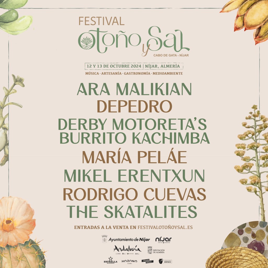 Si ya de por sí el planteamiento de un festival en otoño en pleno Parque Natural de Cabo de Gata – Níjar nos parecía apetecible, cuando conocimos el cartel completo nos pusimos una alarma para comprar nuestros abonos en cuanto se abriese la venta. Y es que en ese cartel hay nombres a los que tenemos muchas ganas de ver en directo y que por hache o por be no hemos conseguido hasta la fecha, como es el caso de Rodrigo Cuevas y Derby Motoreta’s Burrito Kachimba. A María Pelaé la vimos el verano del año pasado en El Ejido y disfrutamos un montón con su propuesta, así que tenemos muchas ganas de volver a verla.
