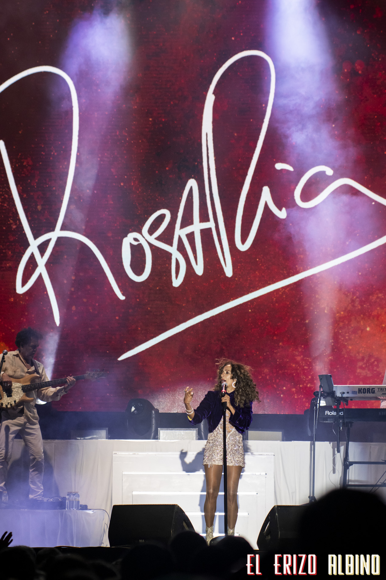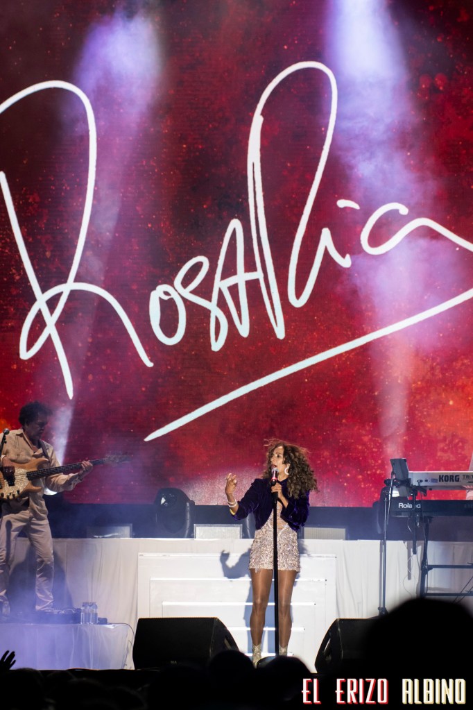 Después de Xoel, nos tomamos otro descanso para cenar, pero con la precaución de volver a tiempo para encontrarnos con la propuesta de Rosario. Era la primera vez que veíamos en directo a la pequeña de los Flores, y teníamos bastante curiosidad. Lo primero que saltaba a la vista era la transformación que había sufrido el escenario, con una plataforma blanca con 2 alturas diferentes con una escalera central, en la que se distribuían los diferentes instrumentos de la gran banda que acompaña a la artista, un total de 11 componentes entre instrumentistas, coros y baile.