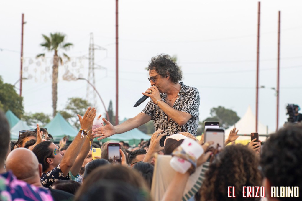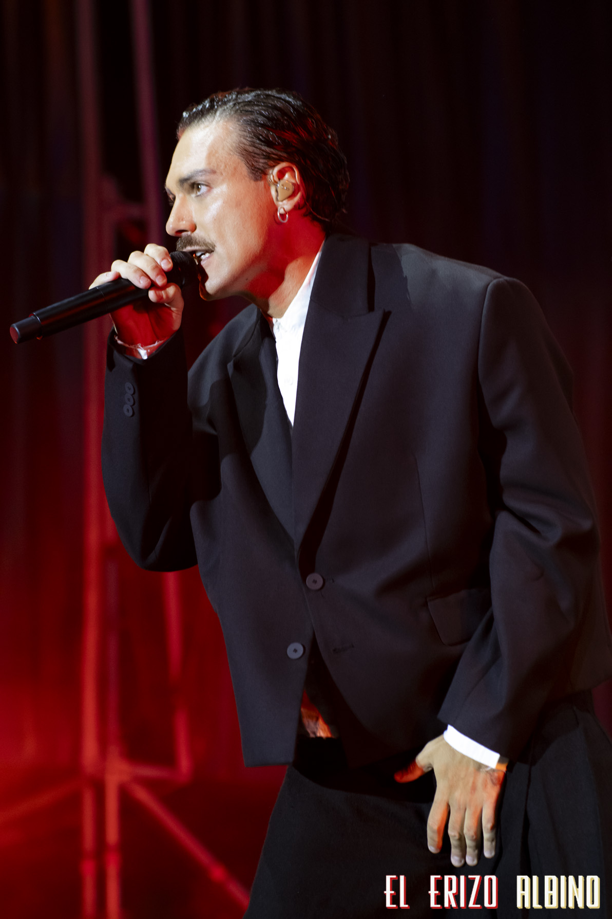 El comienzo del concierto fue muy efectista, con vídeo de estética religiosa/monástica y Alberto ataviado con túnica y capucha azul, mientras sonaban acordes con el tema «¡Oh! Sana» elegido para abrir su turno de actuación. Tras quitarse la túnica y dejar al descubierto su indumentaria de chaqueta negra y camisa blanca, el grupo siguió con «Punto muerto», tema que en disco contó con la colaboración de Ana Torroja, y uno de mis favoritos de El año del tigre (Warner Music, 2022). Por cómo cantaba y bailaba el público, también lo es de la gran mayoría de los que había congregados en el Escenario Estrella Levante.