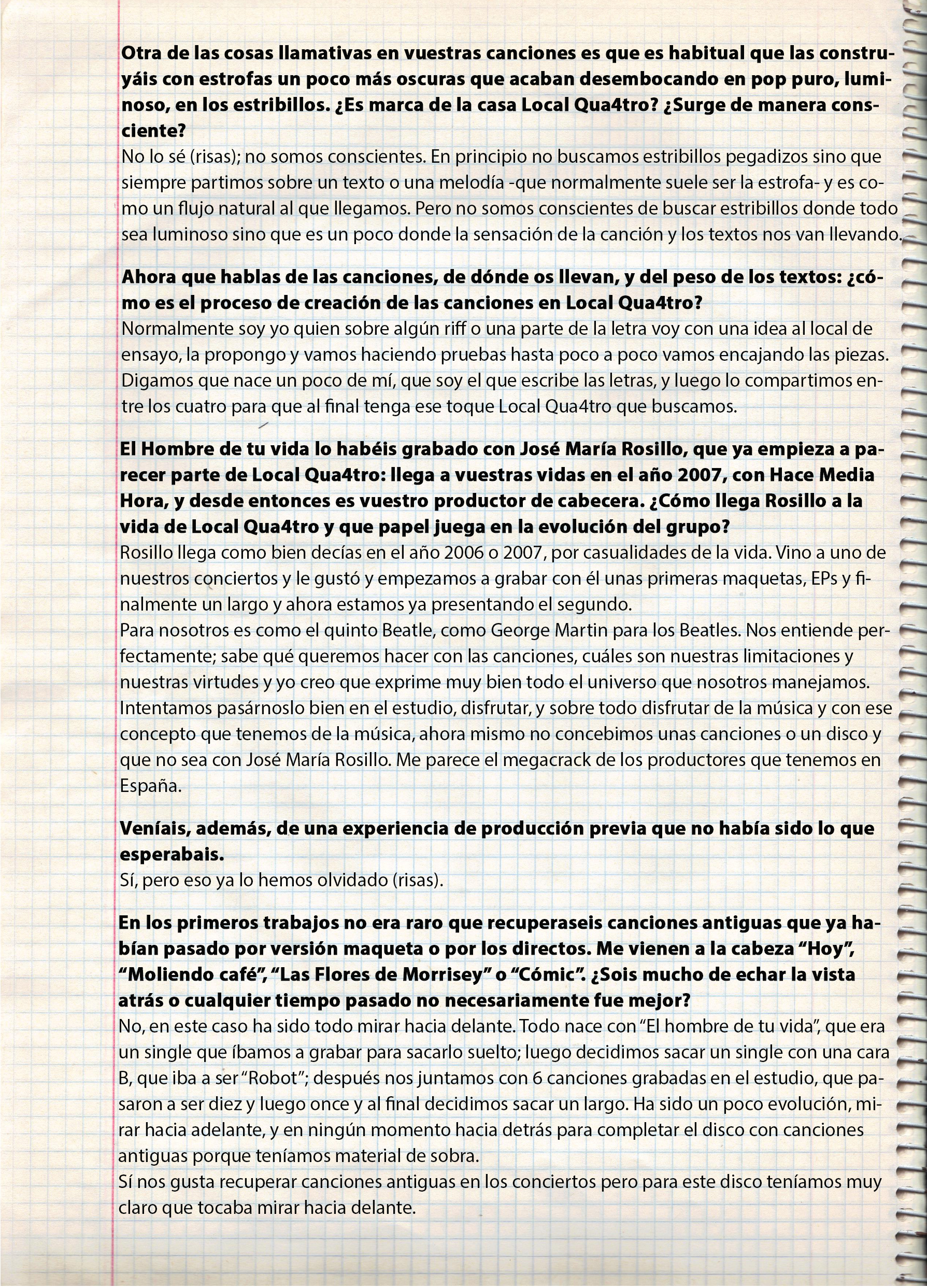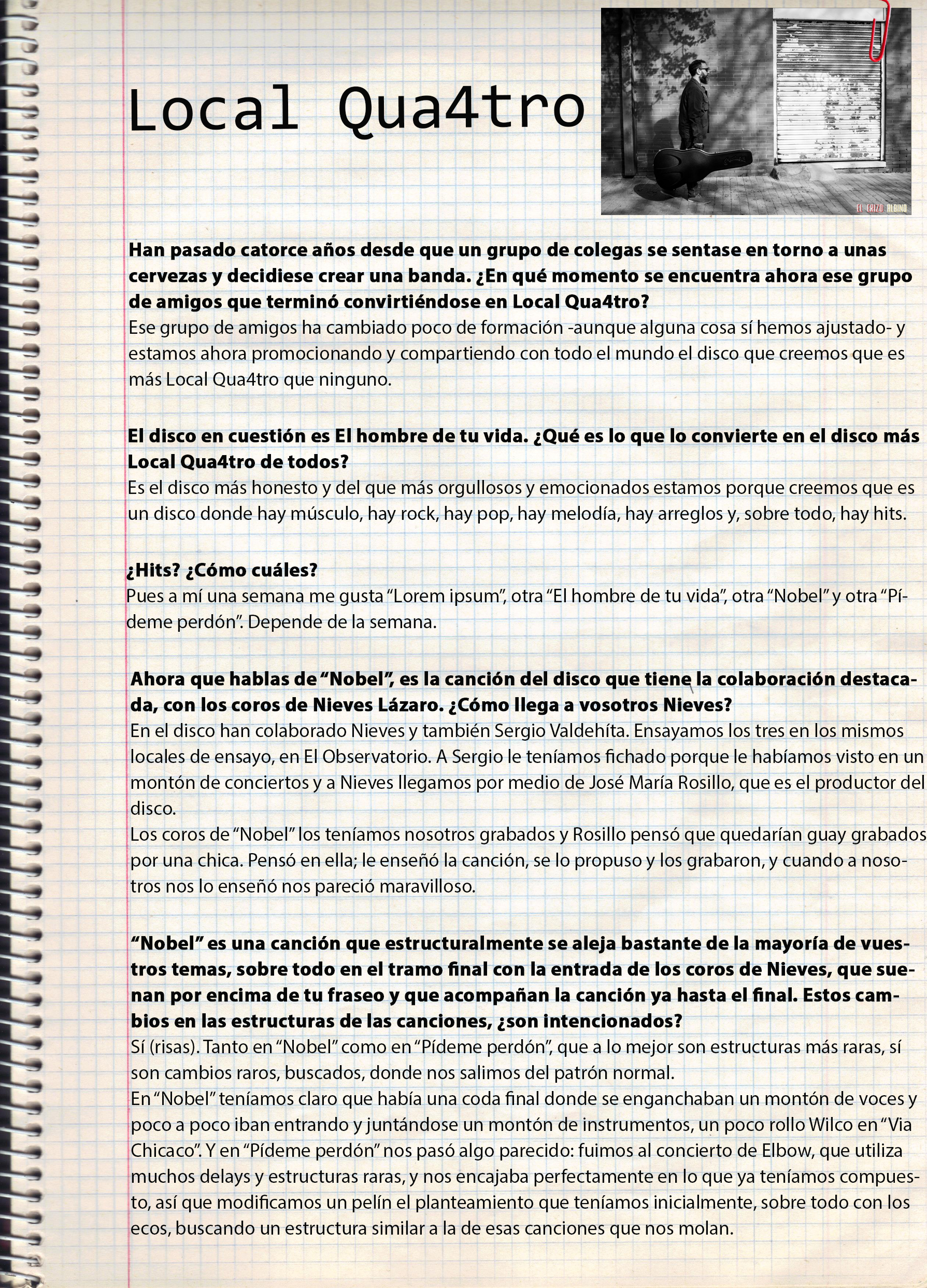 No tardamos mucho más en descubrir a la formación madrileño-extremeña y apenas unos meses después, en septiembre, vimos por primera vez en directo al entonces quinteto. El camino recorrido desde entonces ha sido enorme y el crecimiento de Local Qua4tro, EP a EP, y disco a disco ha sido notable y, diríamos, que bastante meditado. Su personalidad, un sonido muy peculiar y su eterna búsqueda de la canción perfecta han sido sus compañeros de viaje y de eso, de su último disco –El Hombre de tu Vida- y la música en general charlamos hace unos meses con Rober.